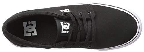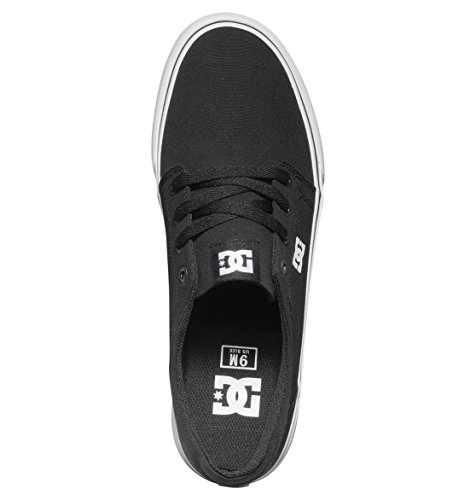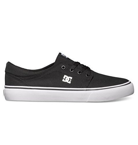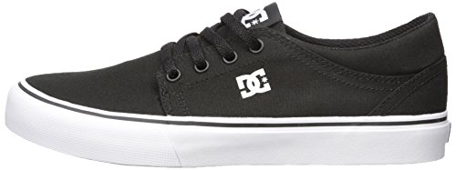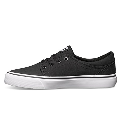 DC TRASE TX. Skateschuh aus Canvas; Low-Cut Silhouette; nahtlose Zehenkappe; breiter Gummirand mit Kontraststreifen; verbundenes EVA-Fußbett; Fersenstabilisator; DC-Logodetails an der Zunge, Seite und Außensohle; abrieb- und rutschfeste vulkanisierte Wrap Cup Gummiaußensohle mit DCs Pill-Profil.